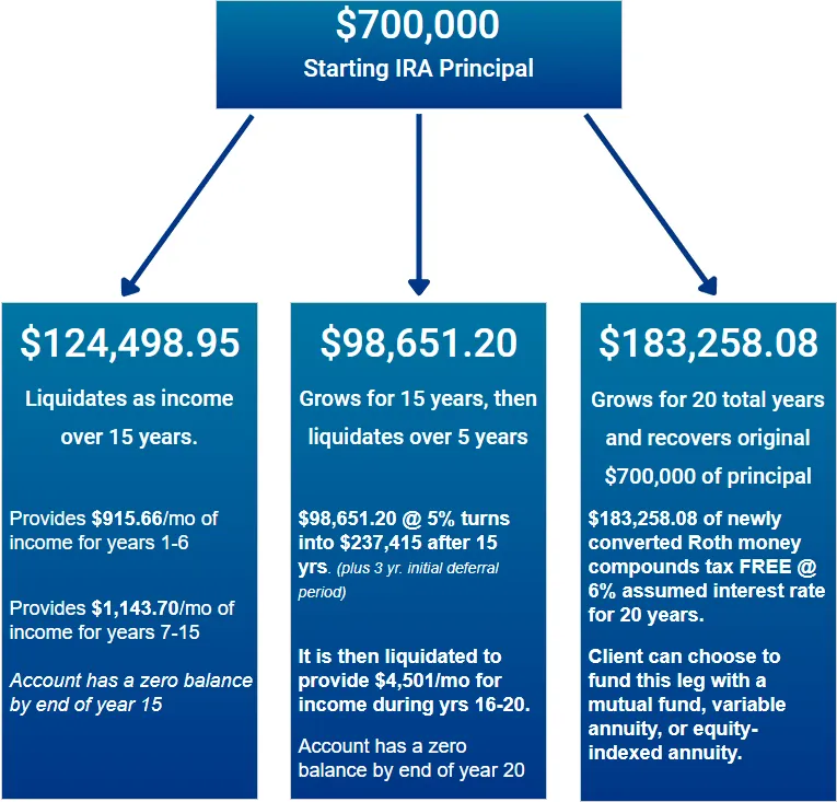 The third leg or “recovery” leg of the plan will be converted to a Roth IRA. By converting only the balance of leg three ($183,258.08) instead of the entire $700,000 IRA principal, it will cost significantly less taxes (only $58,642.59) than if you were to perform a full conversion of your entire IRA (which could be several hundred thousand dollars of taxes in contrast).