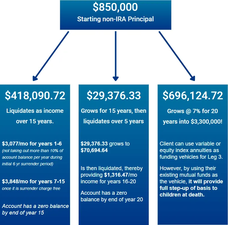 First, instead of taking your assets and just purchasing one big annuity, we divide your nest egg into smaller, more easily manageable annuities called “legs” that are each designed with a specific purpose. We then deposit the correct mathematical amount into each leg and structure these legs in the proper sequence. Some legs are designed to pay you income,